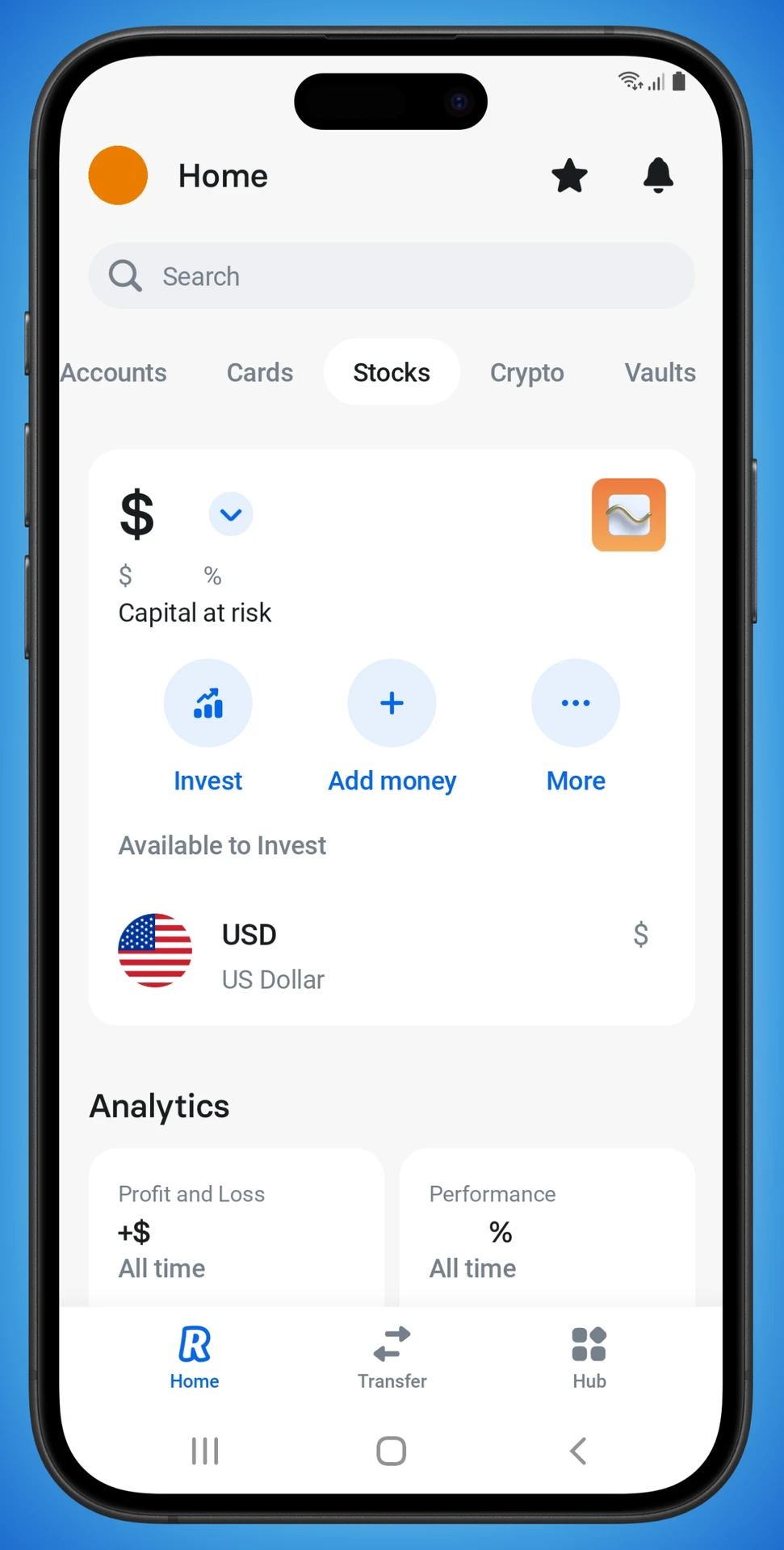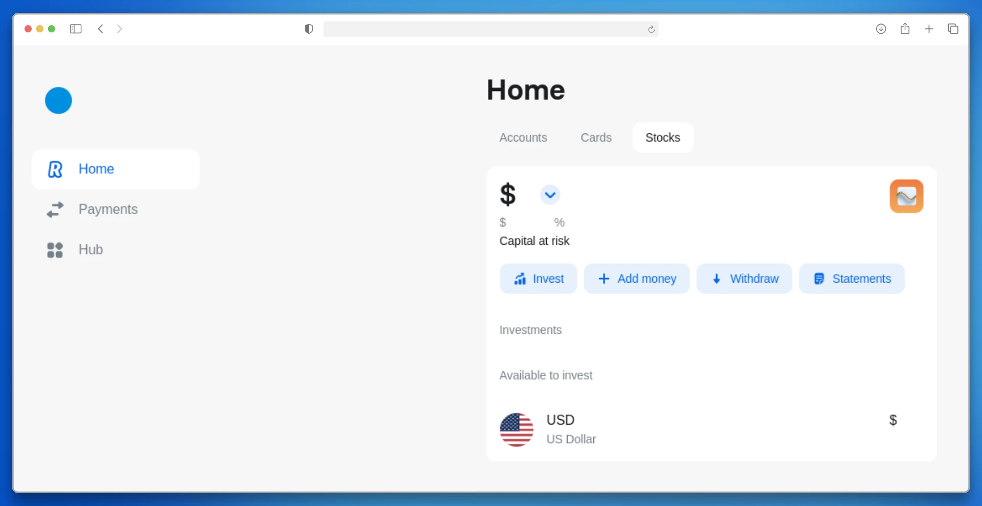 1. Inicie sesión con un navegador en su computadora revolut.com. Obtener autorización. Elija la pestaña Stocks.